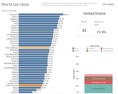 How should we rank the nations? Taxes per person? Or taxes as a percentage of GDP? Either way, the U.S. is far behind many rich nations. (Go here to see the charts in their original not-blurry form.)
